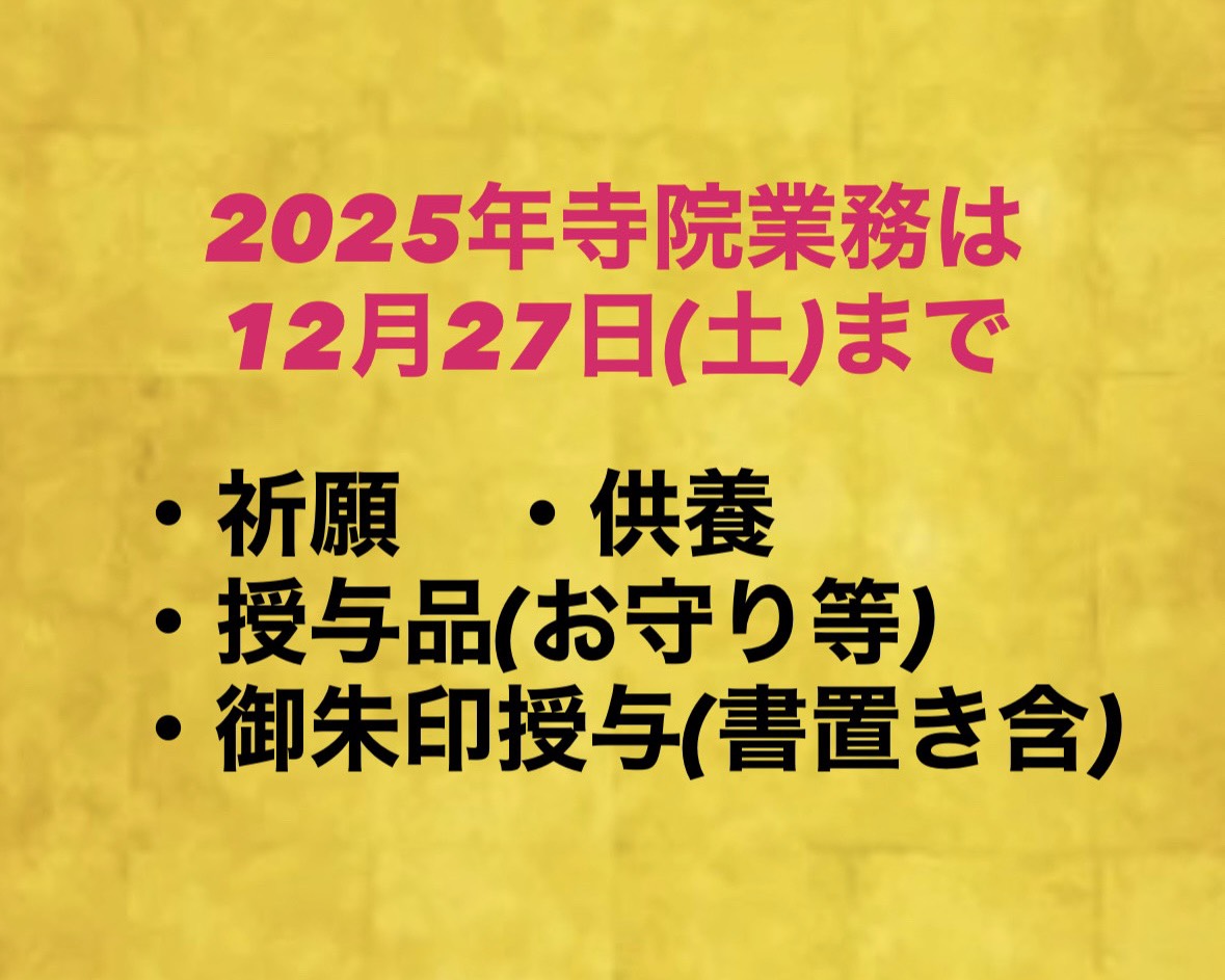 本年の寺院業務は初詣準備の都合上 12月27日(土)までとなります。 (祈願・供養の予約受付業務はお電話やメールにて28日以降も通常どおり行なっております。) 御朱印の浄書、書置き授与を年内ご希望の方は 12月27日(土 ...